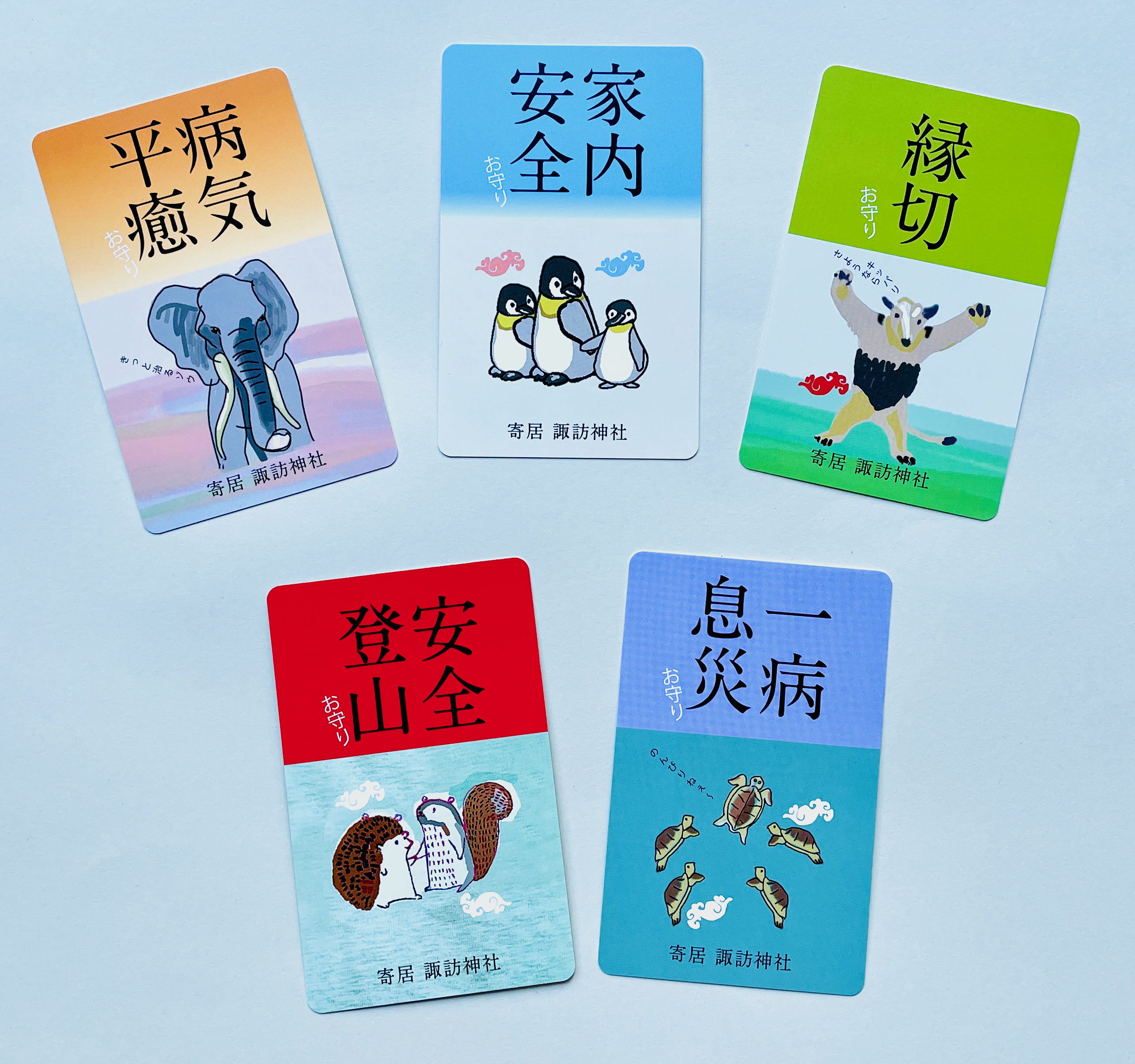 お財布や定期入れに入れて常に持ち歩けるカード型のお守りです。 開運守護、金運上昇、恋愛成就、交通安全、合格祈願。5体セットなら全方向に運気がアップします。 開運守護はふわふわまん丸で福々しいシマエナガ。金運上昇は金運を招く招き猫。恋愛成就は絡まる姿がハート形にも似ているチンアナゴ。交通安全は飛び跳ねて危なっかしいウサギ。合格祈願は学問の神あるいは福の神のフクロウ。 それぞれのお守りの裏側にはユニークなメッセージが書いてあります。 なぜか付いているメモリは、ちょっとしたものを測ったり、写メを撮るときの目安に使ったりできます(厳密には正確な定規ではありません)。 サイズ(約8.5センチ×約5.4センチ)